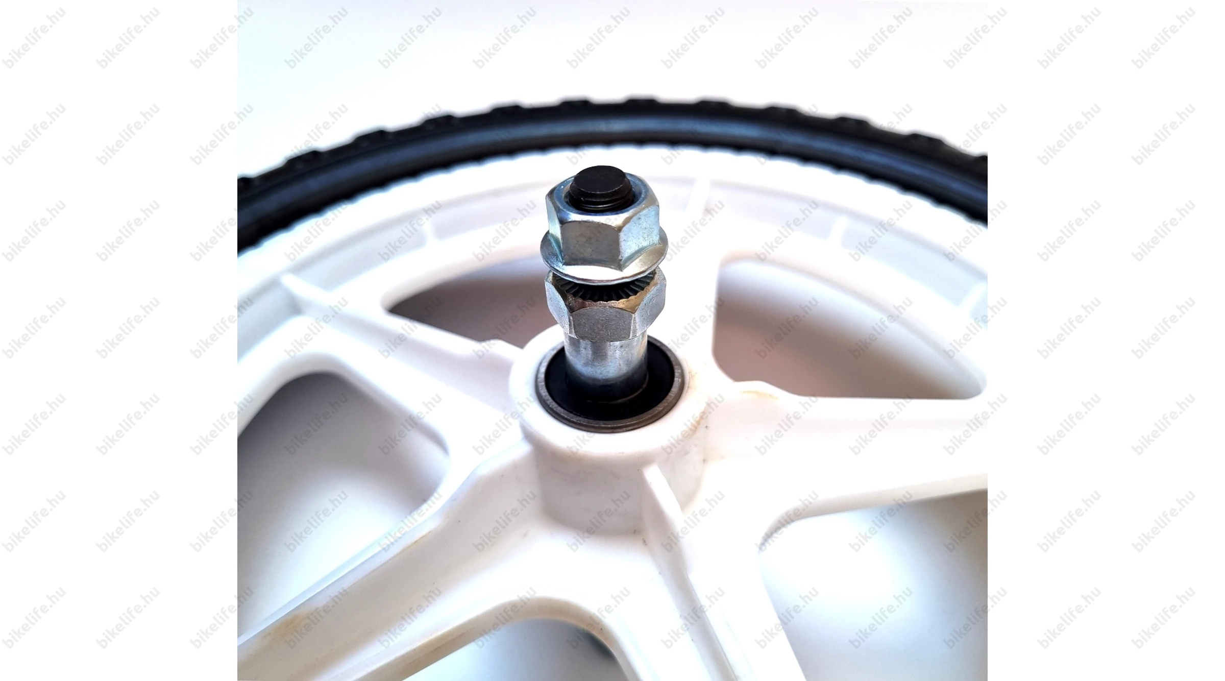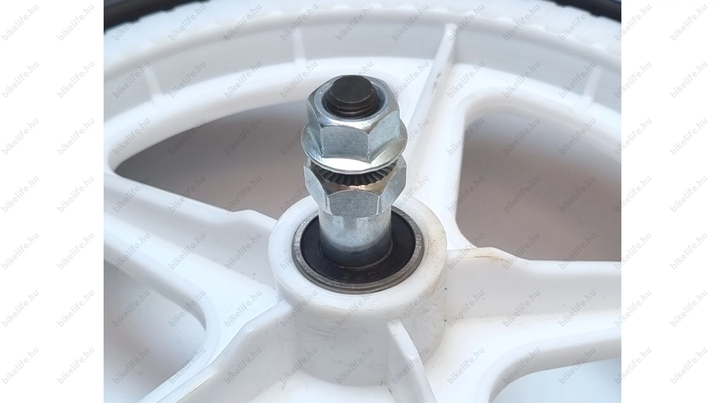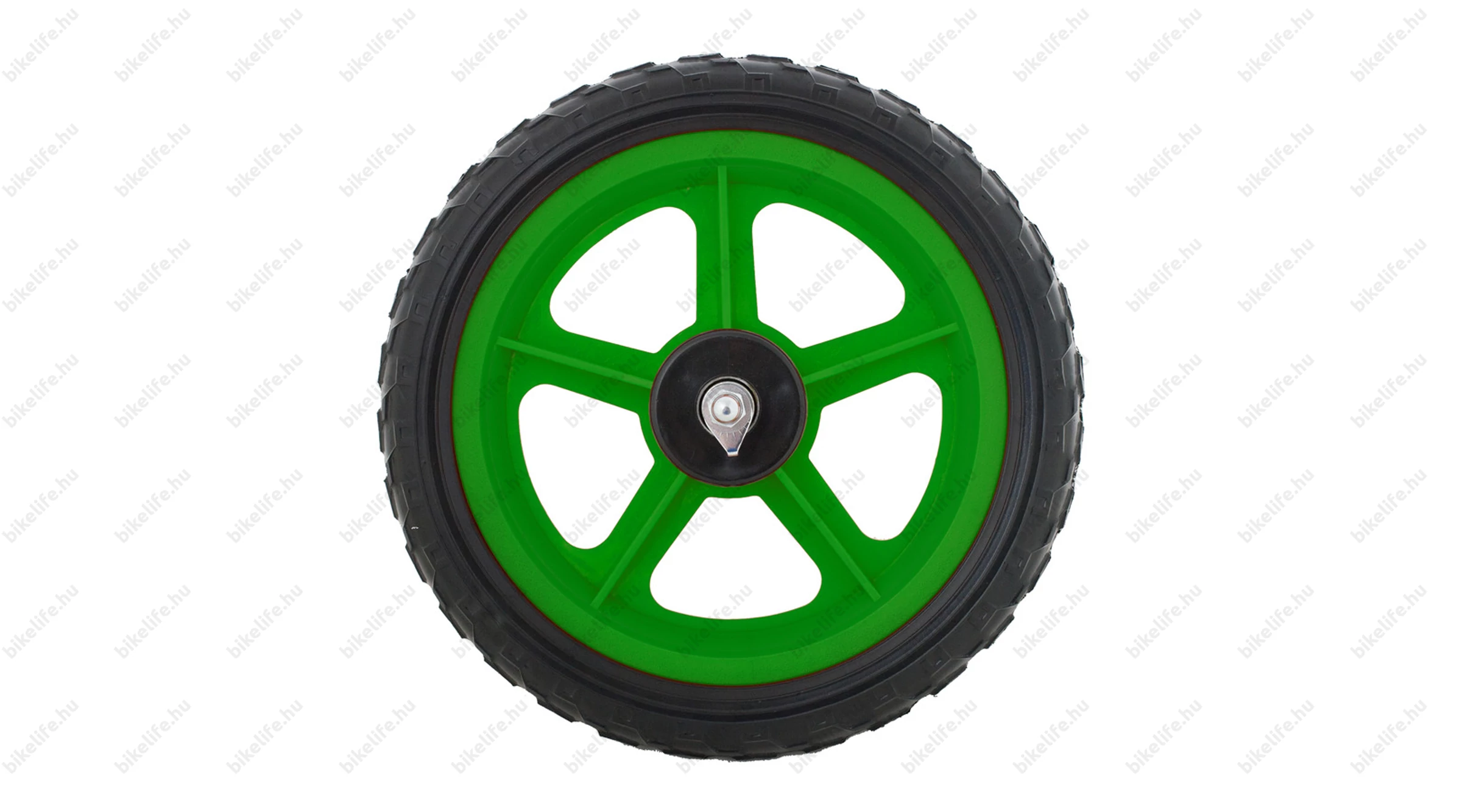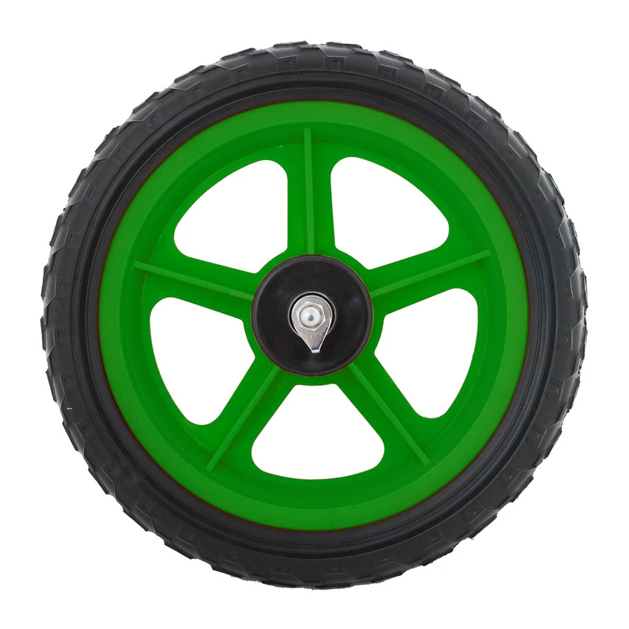 Habosított műanyag "tömörgumis" kerék futóbiciklikbe előre vagy hátra illetve normál hajtható 12-es gyerekbicajok első kerekeként használható. Az ipari csapágyak a hagyományos csészés/golyós/kónuszos megoldásokohoz képest időjárásállóbbak, finomabb futásúak és nem igényelnek karbantartást.