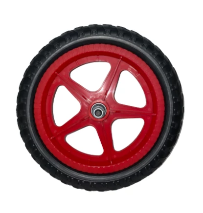 Habosított műanyag "tömörgumis" kerék futóbiciklikbe előre vagy hátra illetve normál hajtható 12-es gyerekbicajok első kerekeként használható. Az ipari csapágyak a hagyományos csészés/golyós/kónuszos megoldásokohoz képest időjárásállóbbak, finomabb futásúak és nem igényelnek karbantartást.
