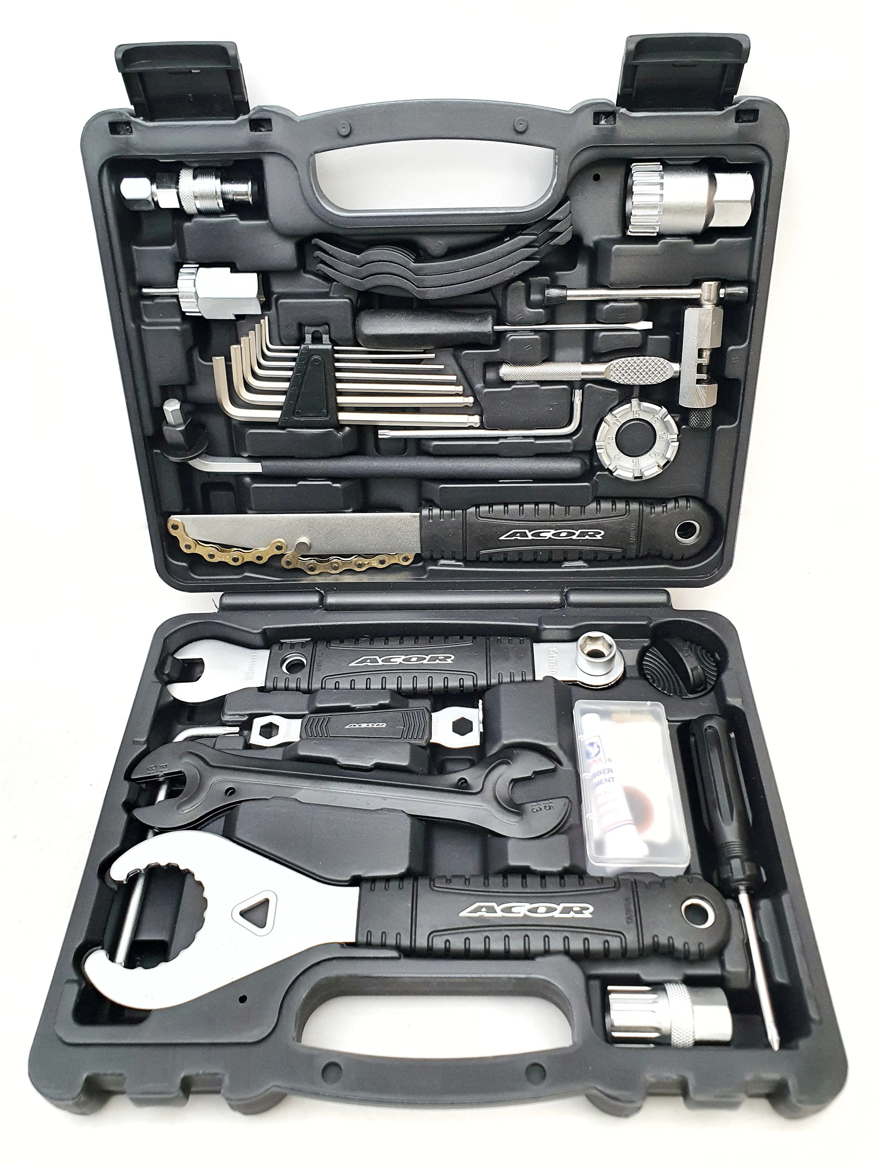 Ha egy ár/érték arányban kimagasló kezdő bringaszerelő szettet keresel, ami minőségben és tartalomban meghazudtolja a nagyobb márkák szerszámkészleteit, akkor ne is keress tovább: az ACOR márka 20 részes kezdő készlete egy nagyon jó választás. A sokrétű szerszám tartalom miatt az alap dolgokat, mint például egy belső ragasztás, kerék ki-be szerelés, bowden feszesség-, vagy váltóállítás pont ugyanúgy meg fogsz tudni lépni vele, mint a komolyabb műhely munkákat, gondolunk itt: Hollowtech középrészek cseréje, országúti hajtóművek ki-be szerelése, racsnik és fogaskoszorúk bontása-cseréje, láncok megfelelő méretűre igazítása, és a sor végtelen, már nem a szerszámokon fog múlni :)