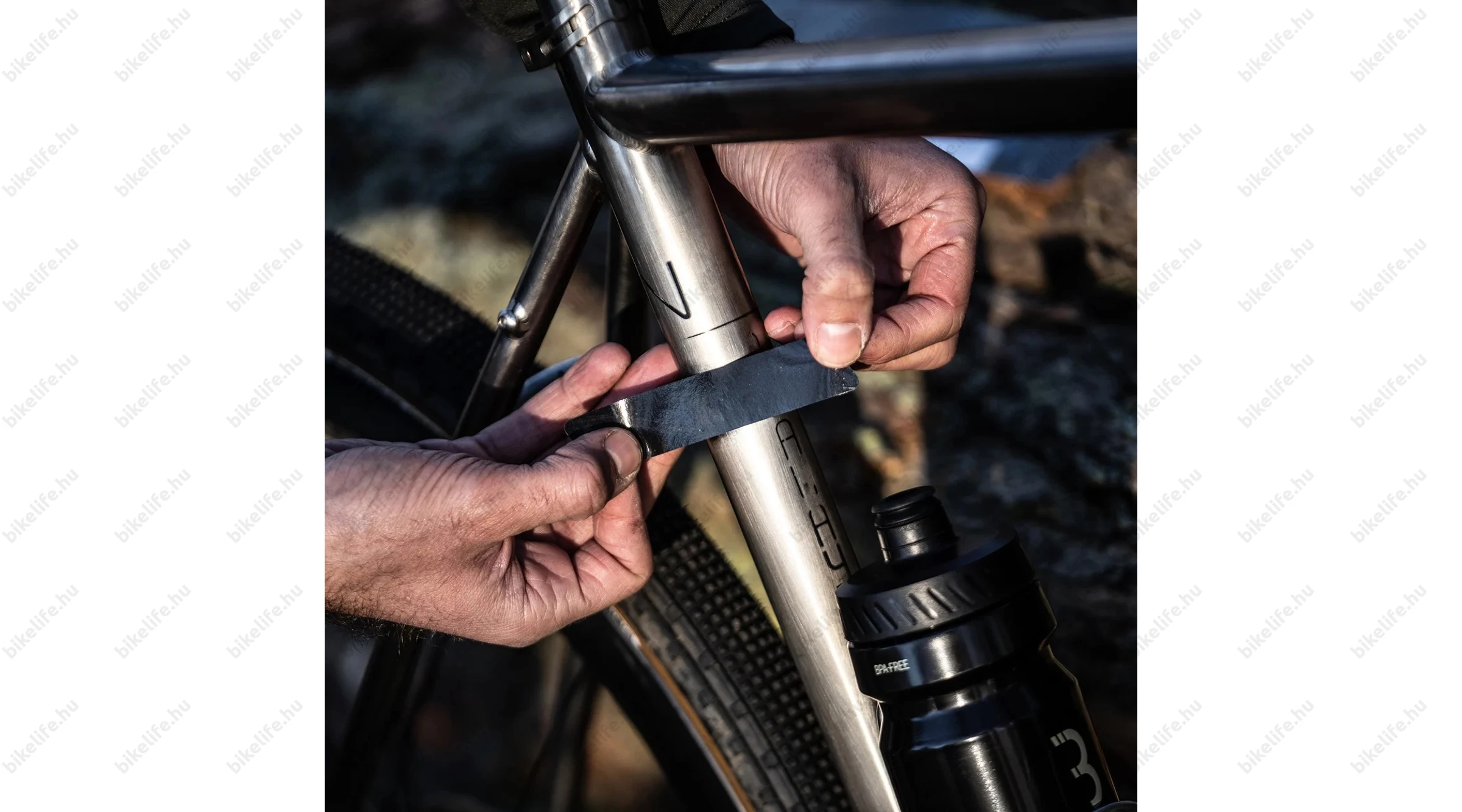 Felhelyezés előtt mindenképp kellően tisztítsd meg a vázat a szennyeződésektől, hogy az öntapadó felület jól rásimulhasson a vázra és jól megtapadhasson azon. Ehhez ajánljuk Neked például a Motorex Bike Clean tisztító folyadékát.