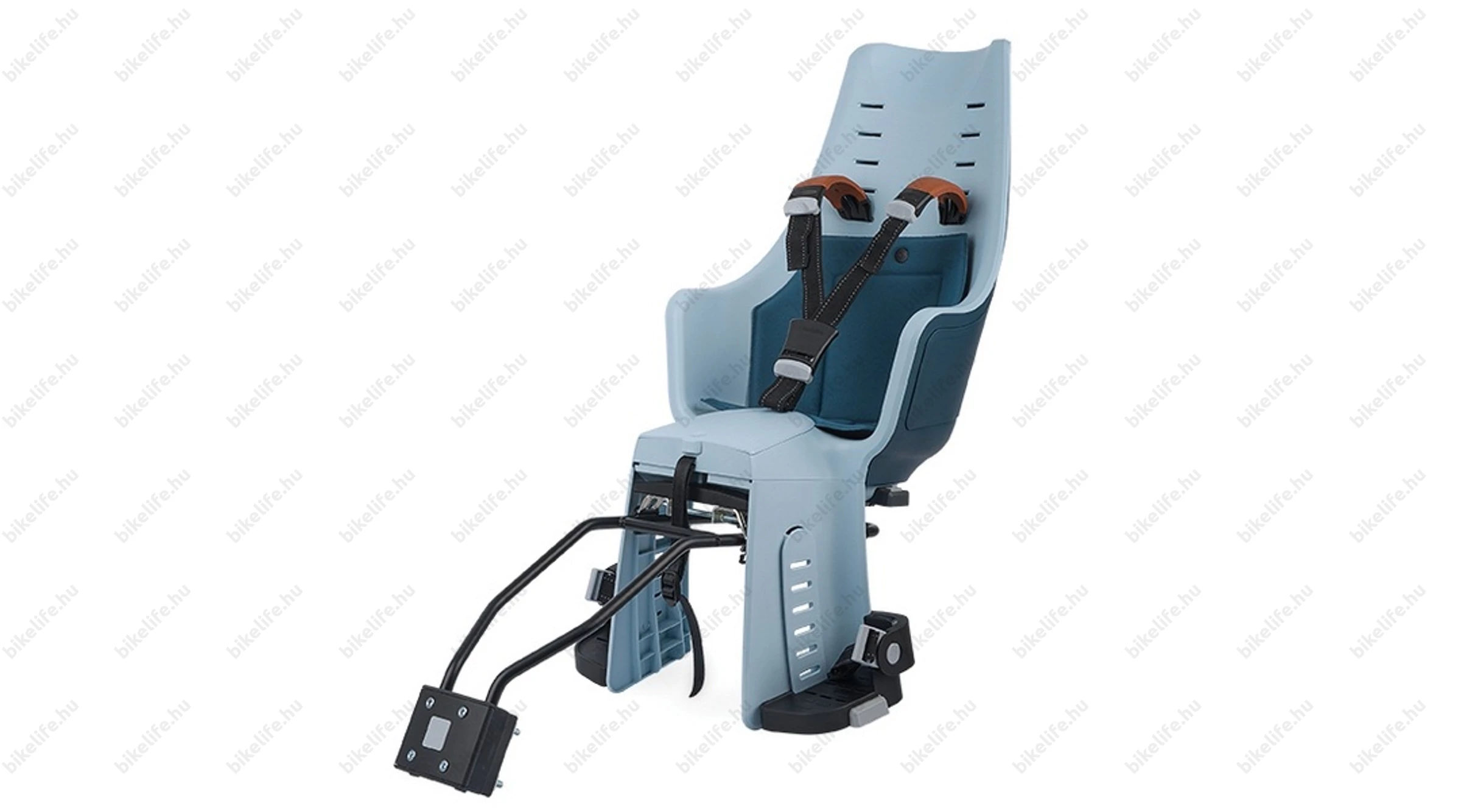 Hátsó vázra és csomagtartóra szerelhető gyermekhordó, 22 kg-ig terhelhető, 3 pontos biztonsági övvel, farmer kék színű