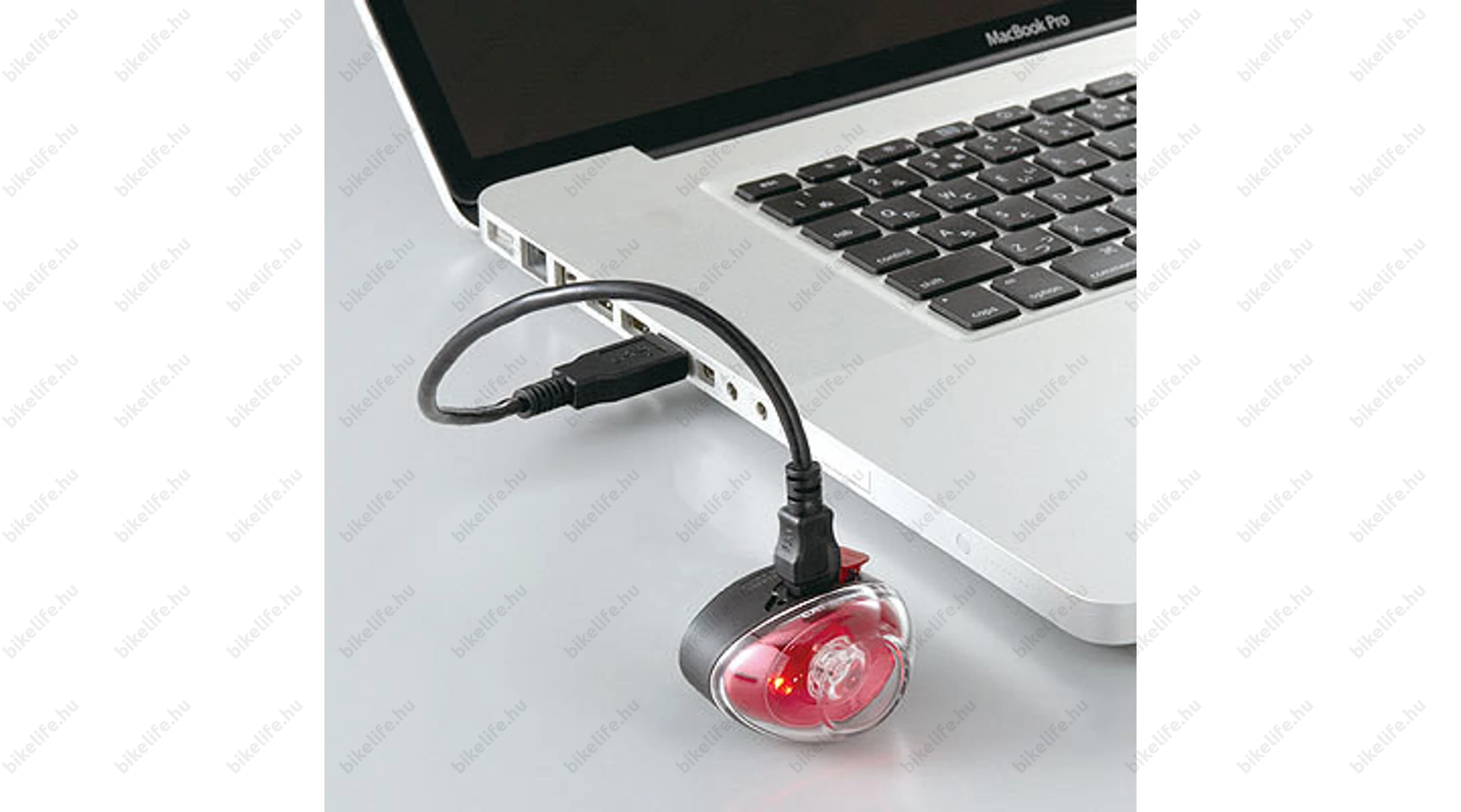 Az akku alacsony töltöttségét külön LED jelzi, mely a foncsoron található. Ha ez világít, még körülbelül 10 percig működik a villogó. A kapcsoló utolsó funkció memóriával rendelkezik. A kikapcsolás bármely fénynél a gomb folyamatos nyomva tartásával történik. Az USB aljzatot a kapcsoló ellentétes oldalán találjuk egy szürke védőfedél alatt.