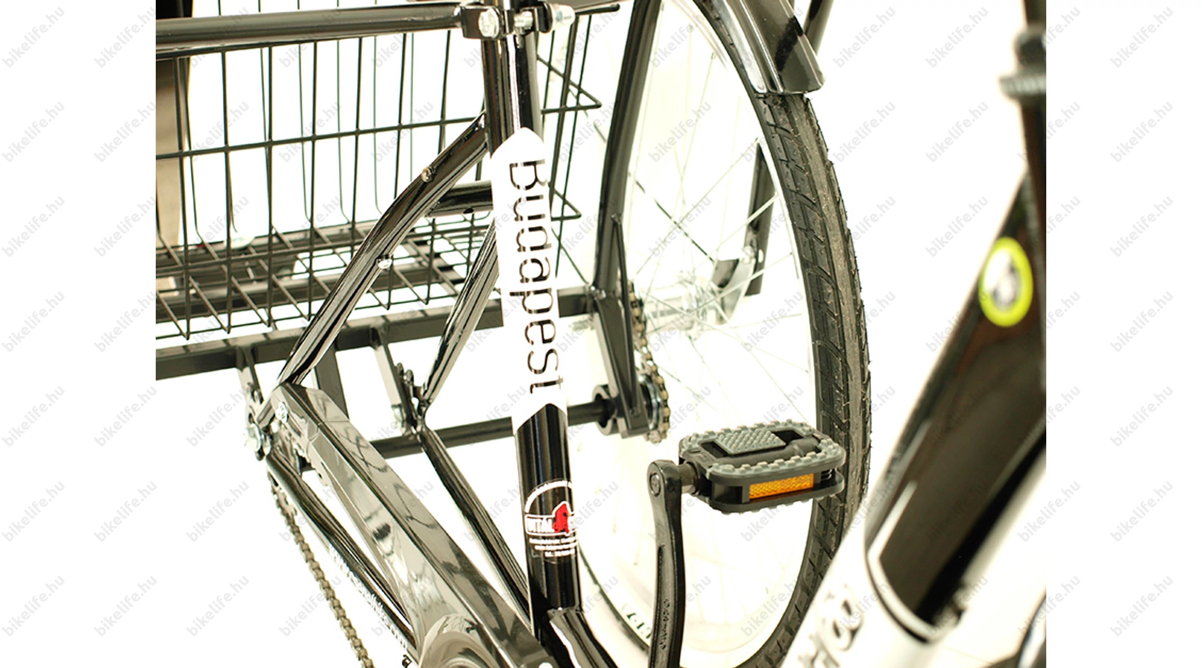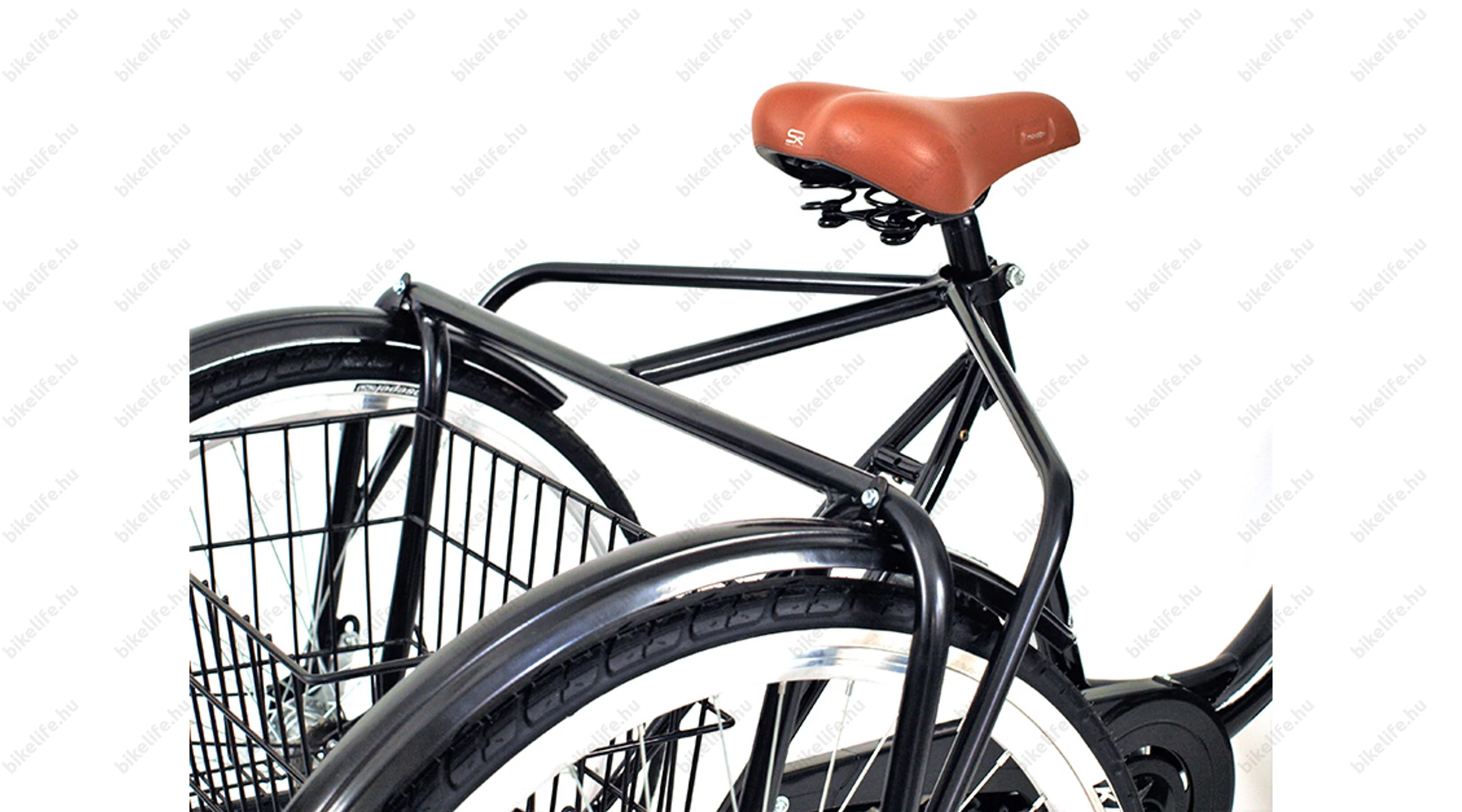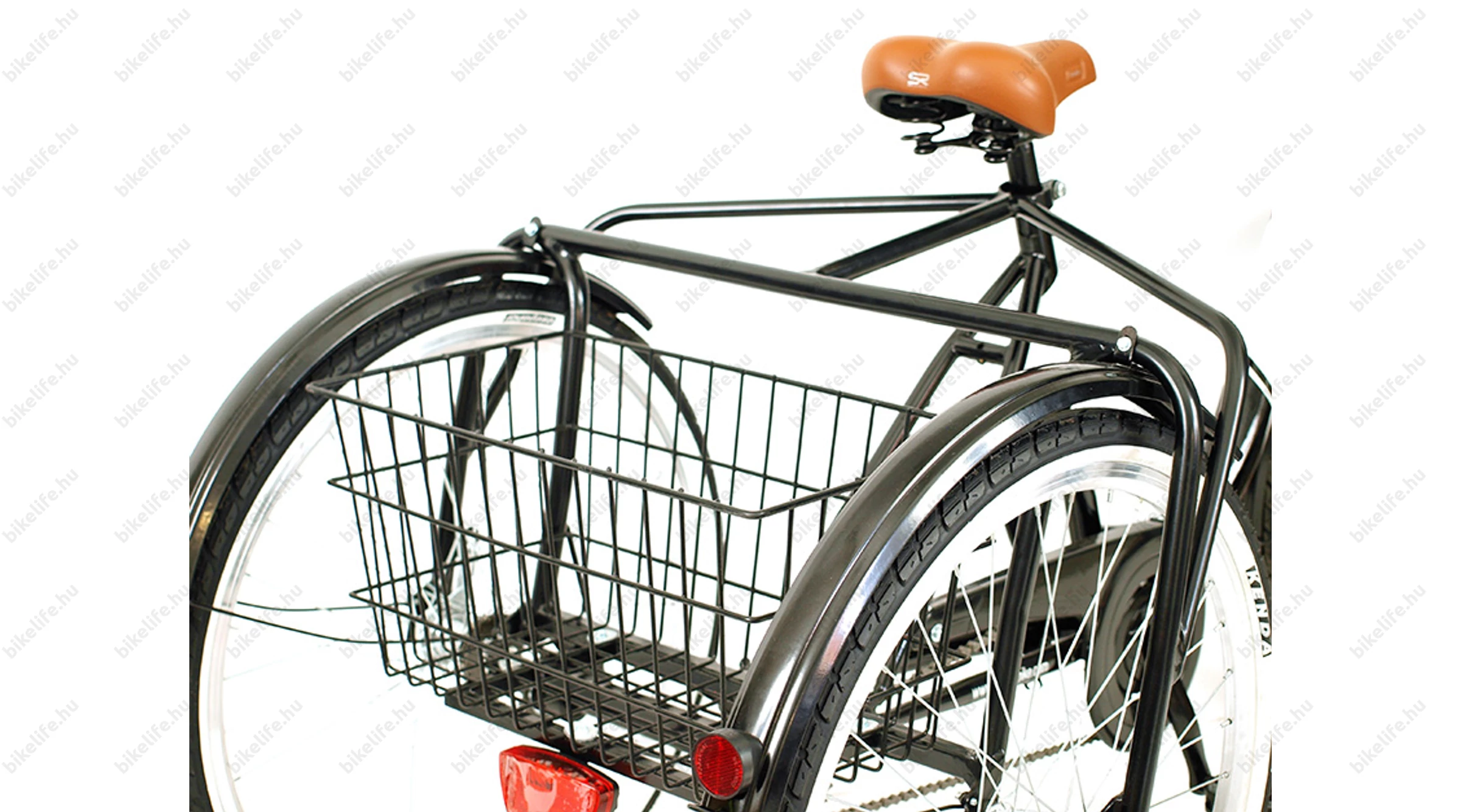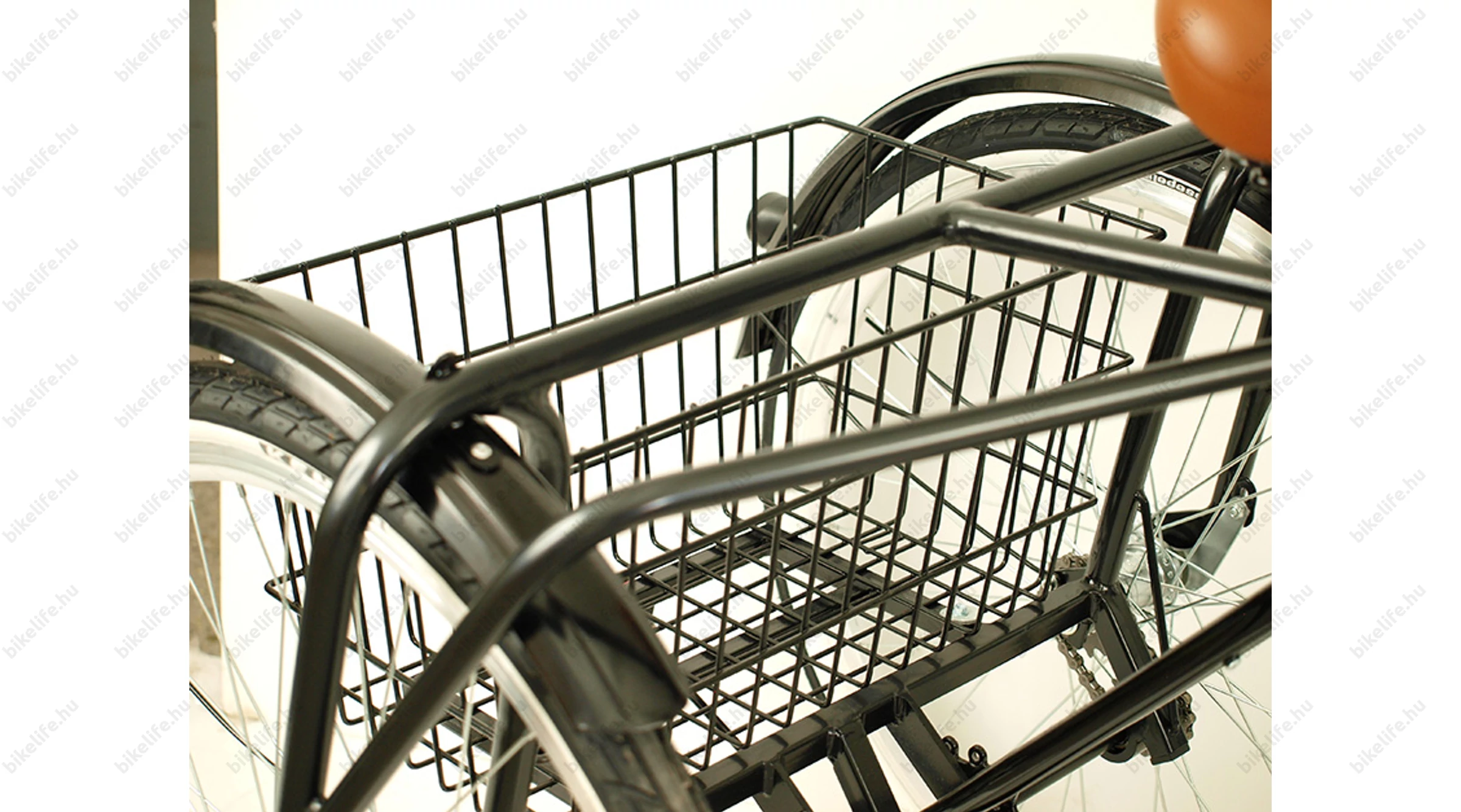 A kerékpár tartozéka egy masszív és nagy méretű kosár, mely fixen van rögzítve a tricikli vázához.