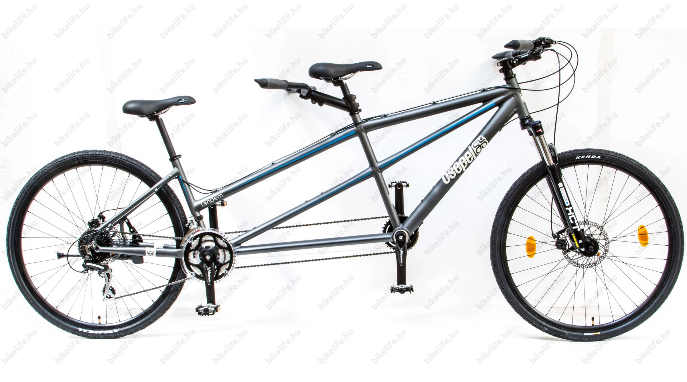 Ebbe a légüres térbe ékrezett meg a Csepel tandemje abszolút vállalható felszereltséggel, konkrétan egy alsó-közép túrabringa specifikációjával és elképesztő 21kg-os súlyával. Bizony, a pilótákra csak 10,5kg jut fejenként, mint egy verseny montin. Hol fogjátok ezt érezni? Brutálisan gyorsítható a bringa, és elkéősztő utazósebességet lehet vele elérni. Bizony ám, naggyából olyan, mintha a bringádat tekerni még valaki más is.