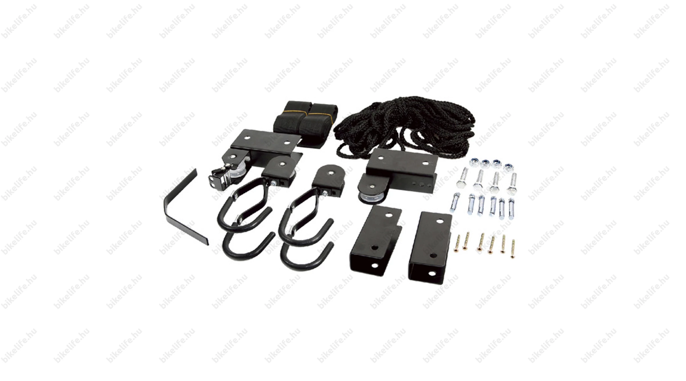 - Tartozékok: csigák, rögzítő kampók, szerelési útmutató, csavarok