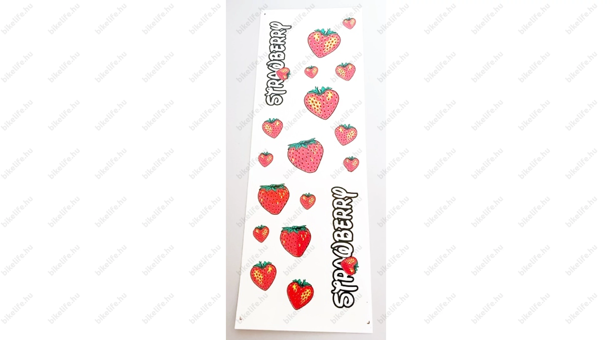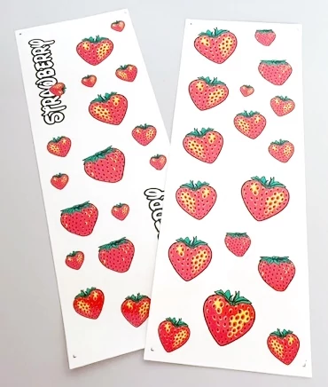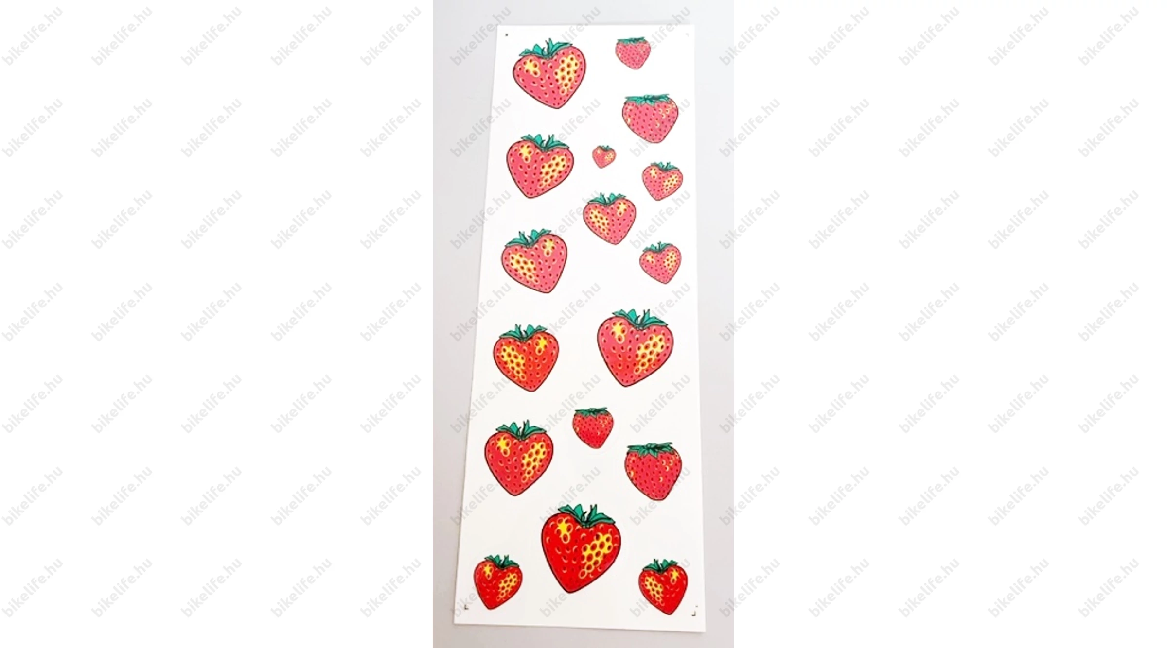 A matrica ív 25x17 cm, ezen több különböző méretű eper helyezkedik el, melyek külön-külön levehetők az ívről, nem kell egyben ragasztani őket.