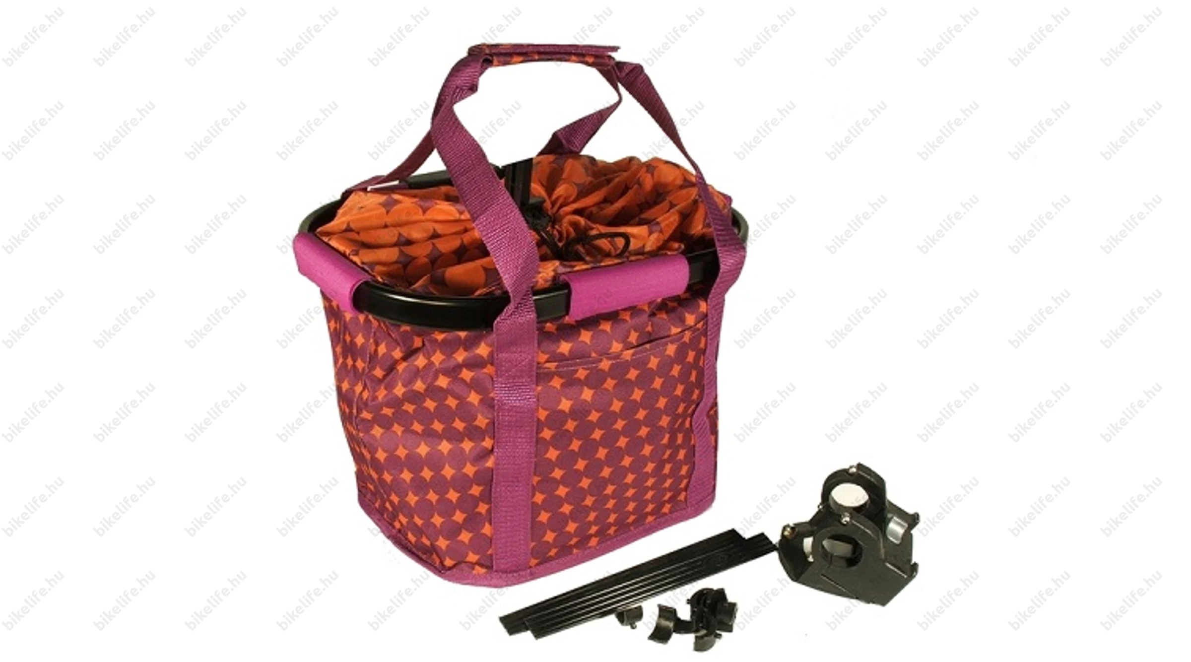Kerékpáros első kosár, alukerettel, merev fenékrésszel, 5 kg-os terhelhetőség, narancs/lila színű