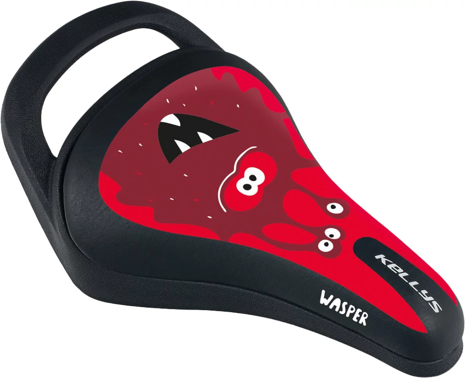 Kellys Wasper 023 gyerek nyereg fogantyúval, piros szörnyecskés