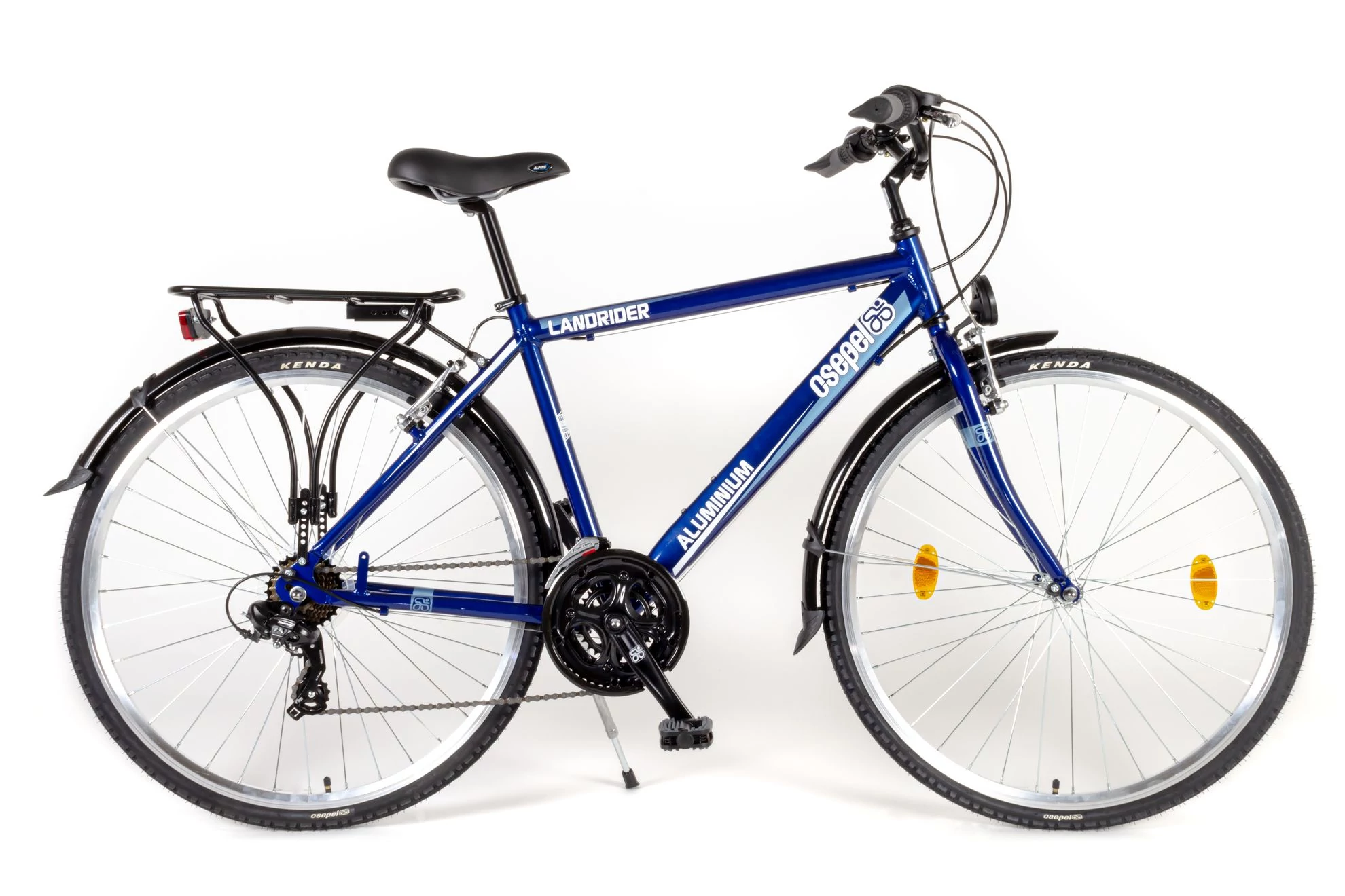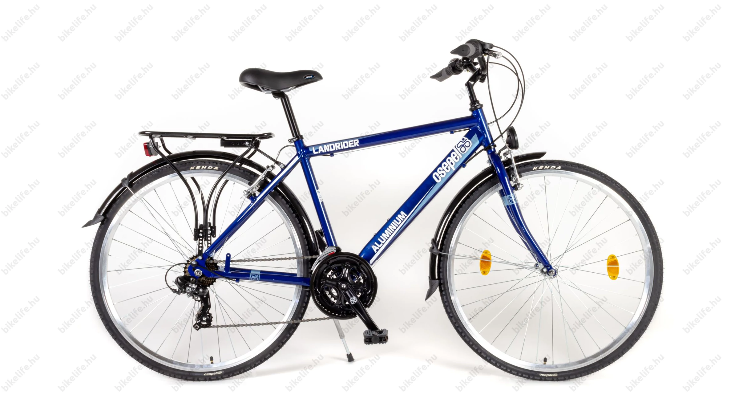 férfi, alumínium váz, 21 fokozatú Shimano váltórendszer, duplafalú felni, sárvédő, csomagtartó és világítás tartozék