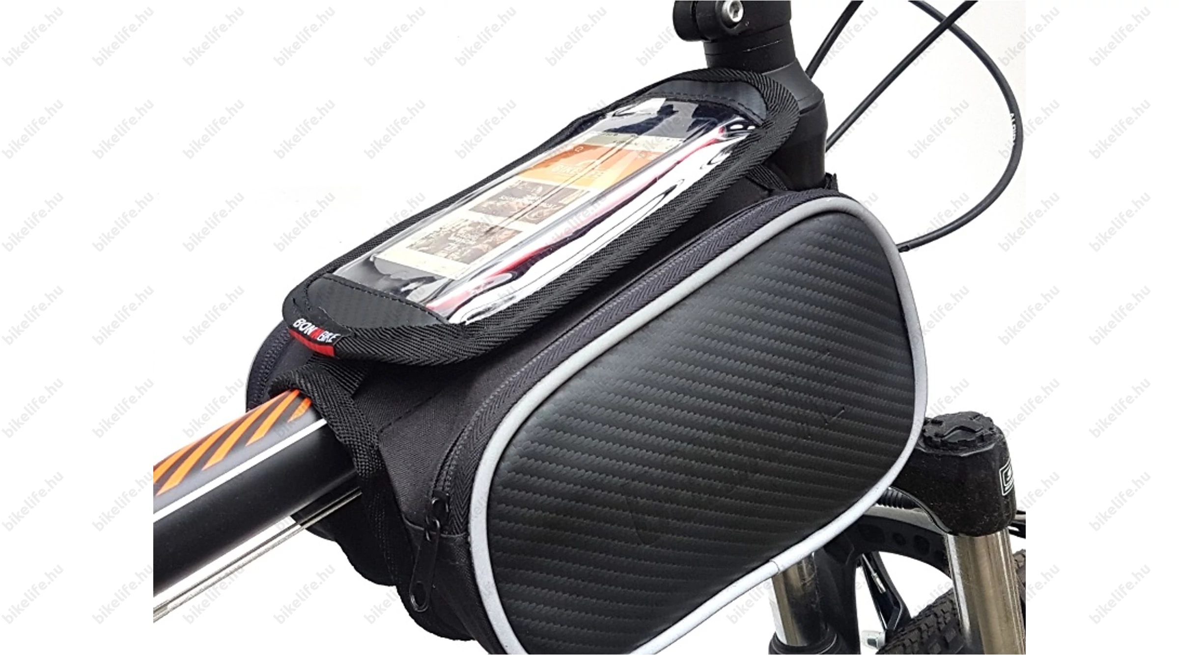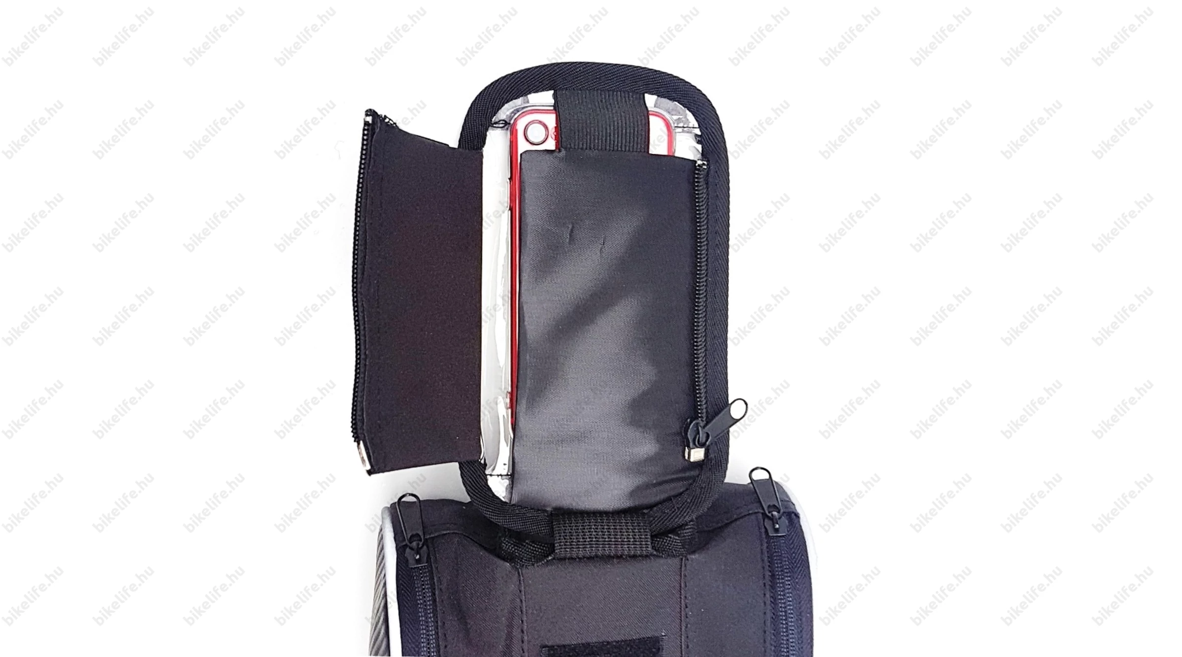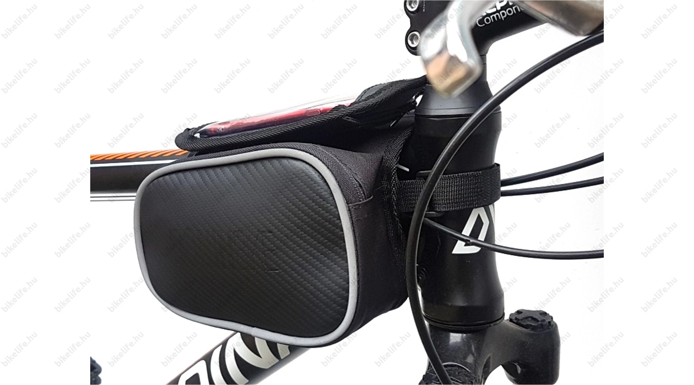 Pár szóban - és számos fotón - megpróbáljuk bemutatni a műalkotást: A mobiltok egy nagyméretű tépőzáras felülettel rögzül a táska tetejére, melyet az egyik oldalon egy fix pánt is biztosít a leeséstől. Az oldalról becsúsztatható telefonunkat egy cipzáras rész fedi és biztosítja a kiesés ellen. Az egész táskát két tépőzáras pánttal rögzítjük a biciklinken. Az egyikkel a homlokcsőnél vagy kormányszárnál (stucninál), a másikkal a felsőcsövön rögzítjük a telefon hordozónkat. Mindezt néhány pillanat alatt...