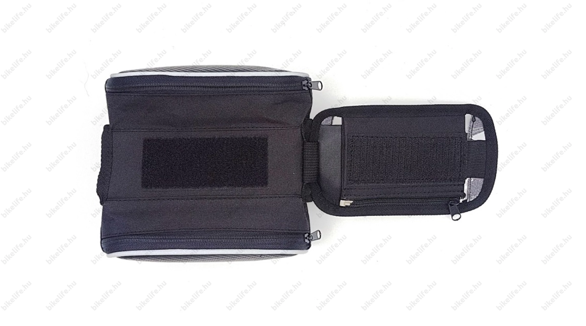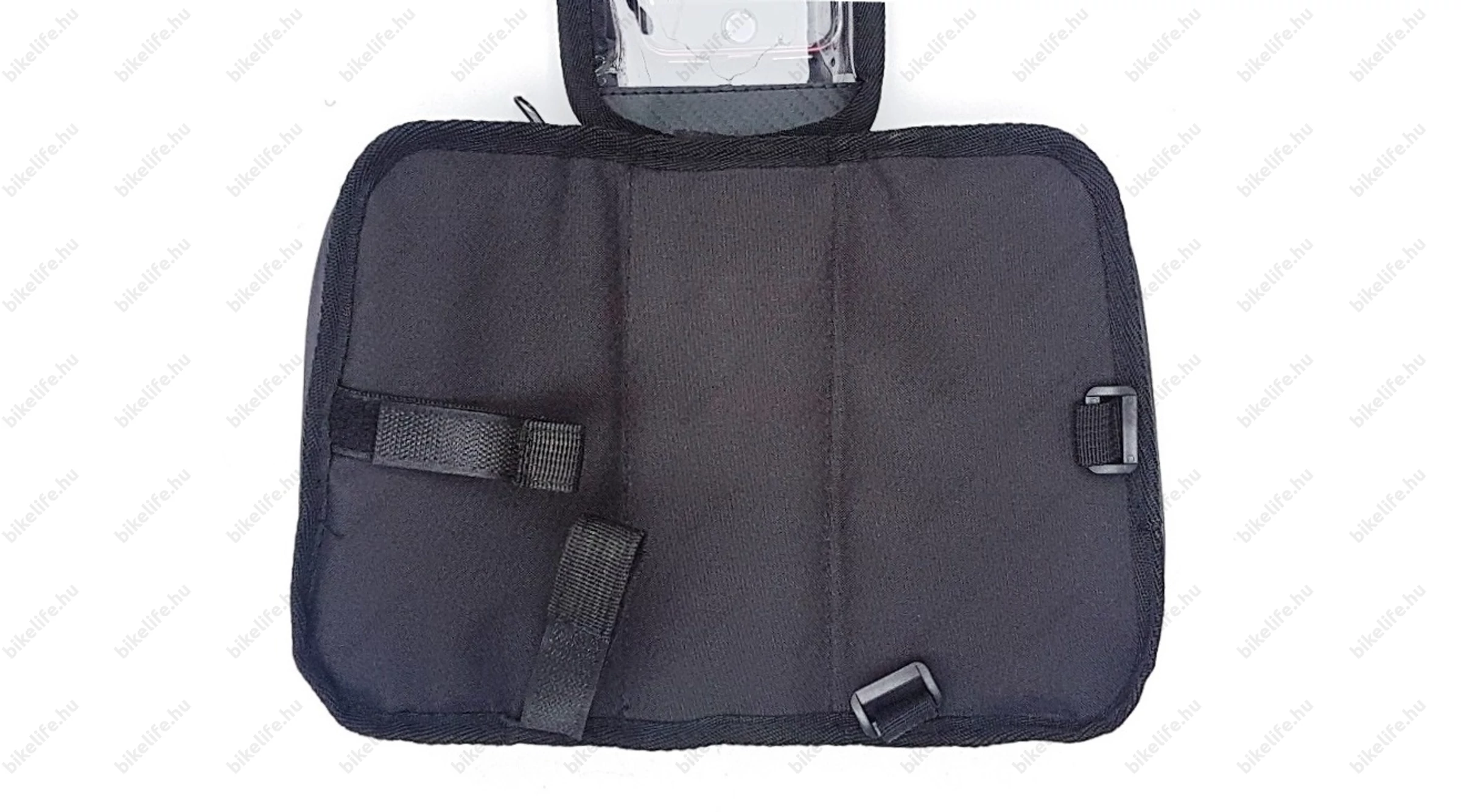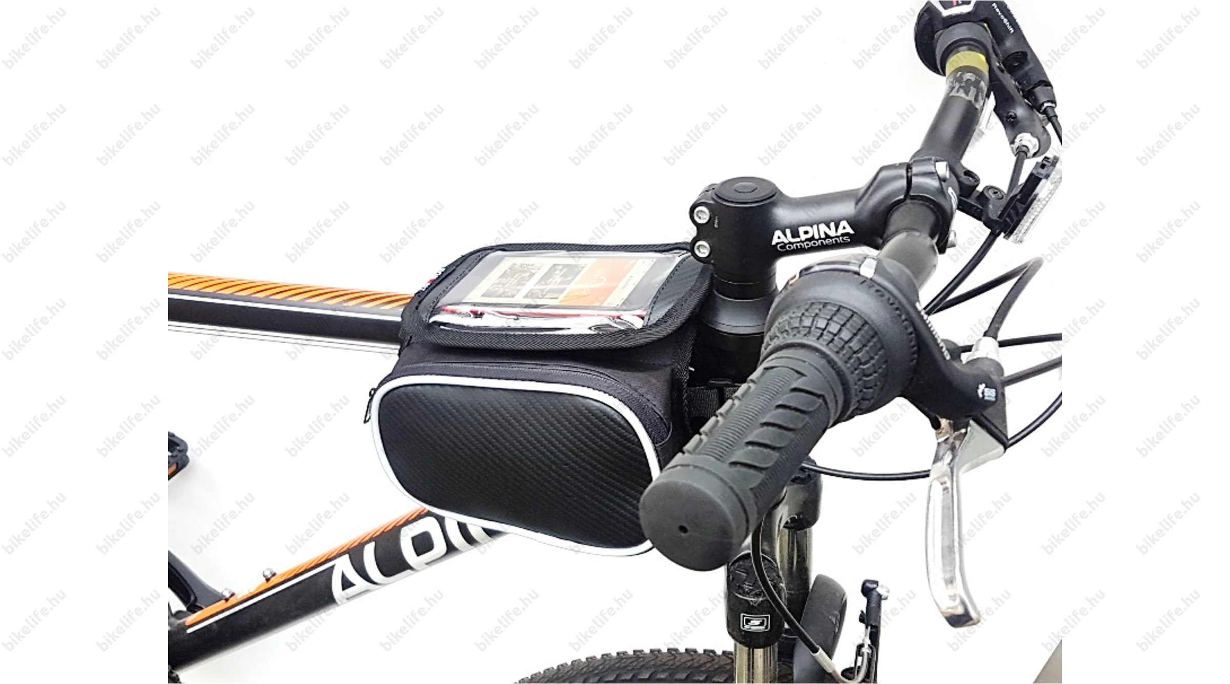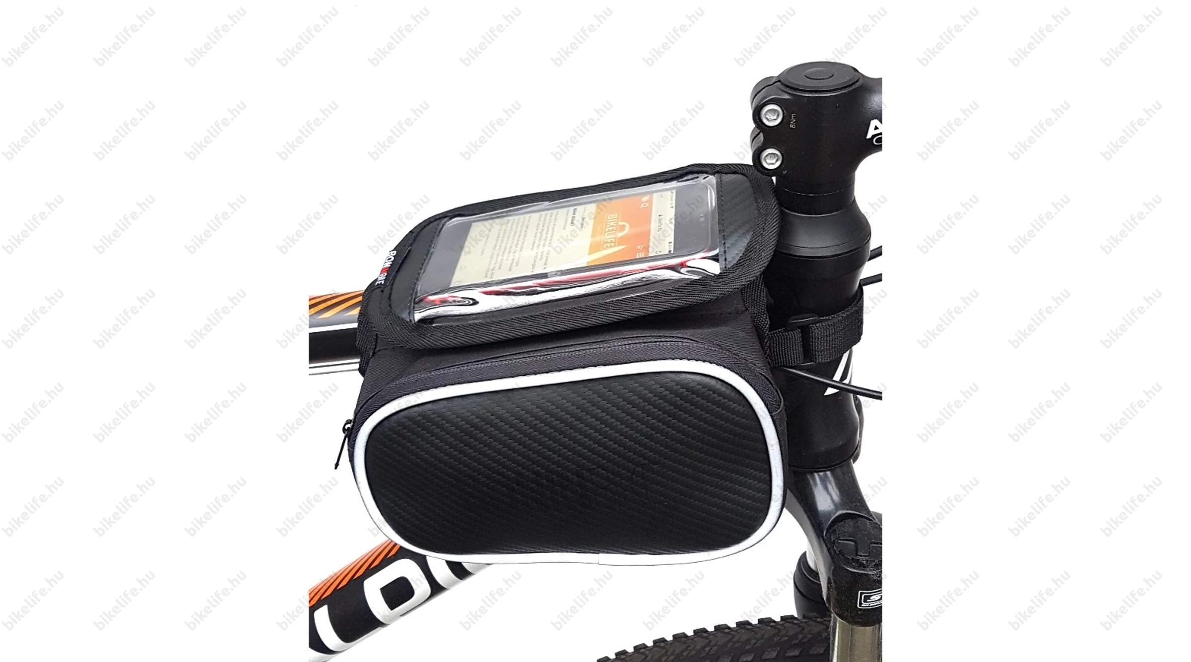 Pár szóban - és számos fotón - megpróbáljuk bemutatni a műalkotást: A mobiltok egy nagyméretű tépőzáras felülettel rögzül a táska tetejére, melyet az egyik oldalon egy fix pánt is biztosít a leeséstől. Az oldalról becsúsztatható telefonunkat egy cipzáras rész fedi és biztosítja a kiesés ellen. Az egész táskát két tépőzáras pánttal rögzítjük a biciklinken. Az egyikkel a homlokcsőnél vagy kormányszárnál (stucninál), a másikkal a felsőcsövön rögzítjük a telefon hordozónkat. Mindezt néhány pillanat alatt...