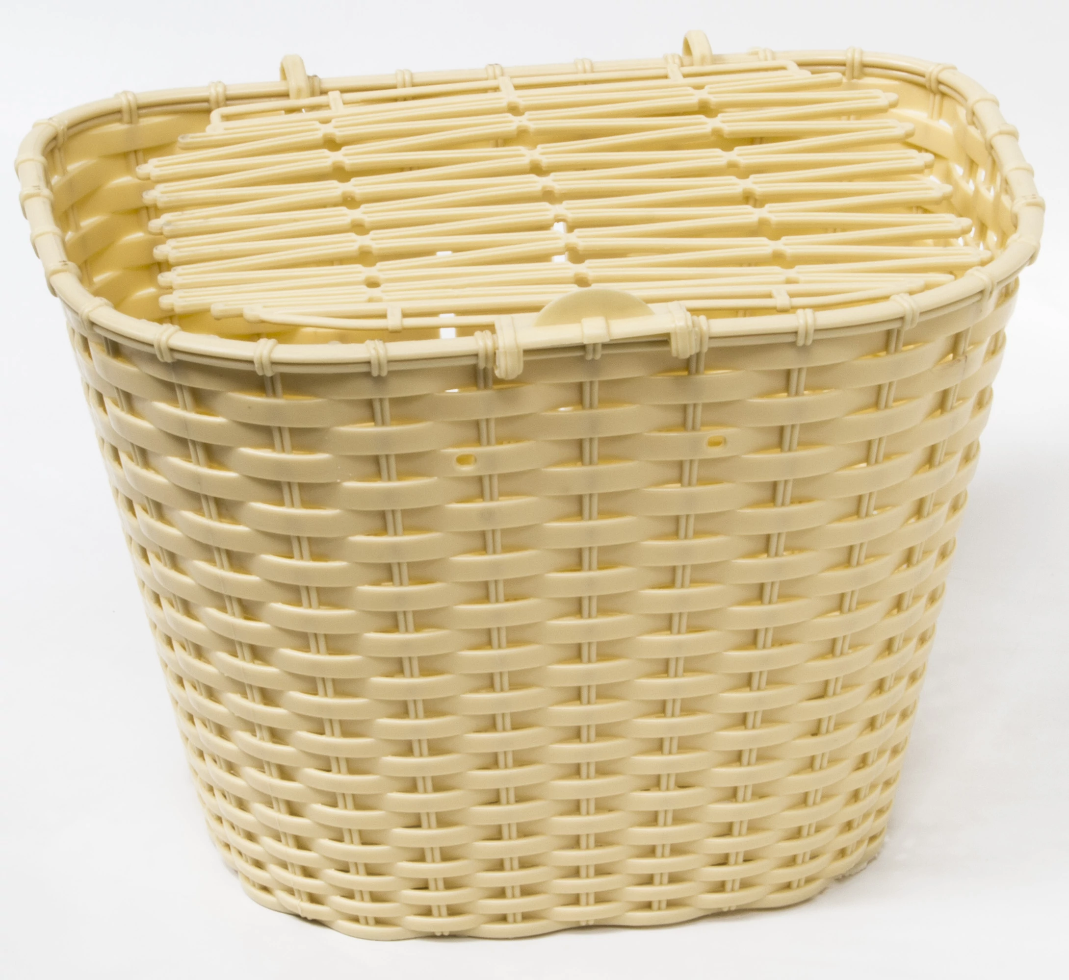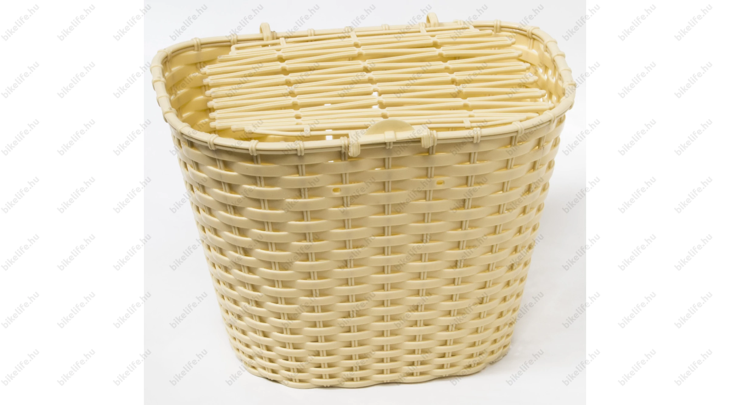 Kerékpáros fix első kosár merevvillás bringákhoz, műanyag, fonott, krém színű, fedeles