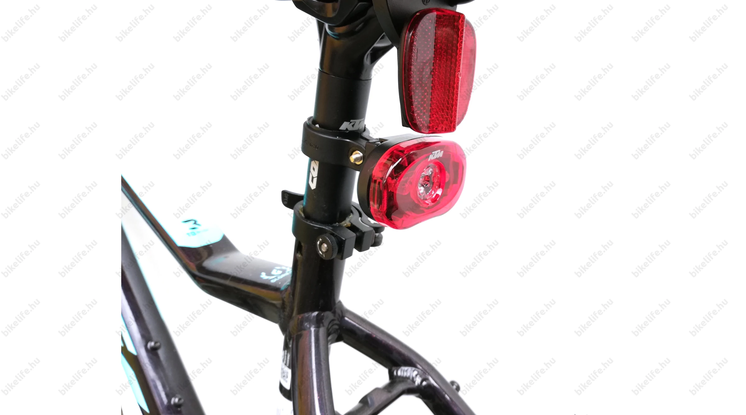 A bilincses rögzítésű hátsó lámpa elhelyezhető a nyeregcsövön, vagy akár a vázon, a támvillán is a két különböző méretű tartozék bilincs segítségével.