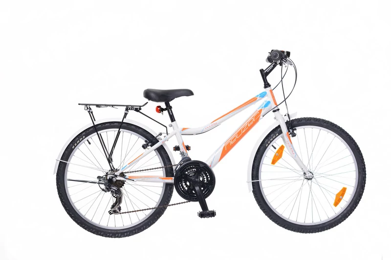 Fehér/naracs színű, sportos bicaj city felszereltséggel, kötelező tartozékokkal kisiskolás korú fiúknak