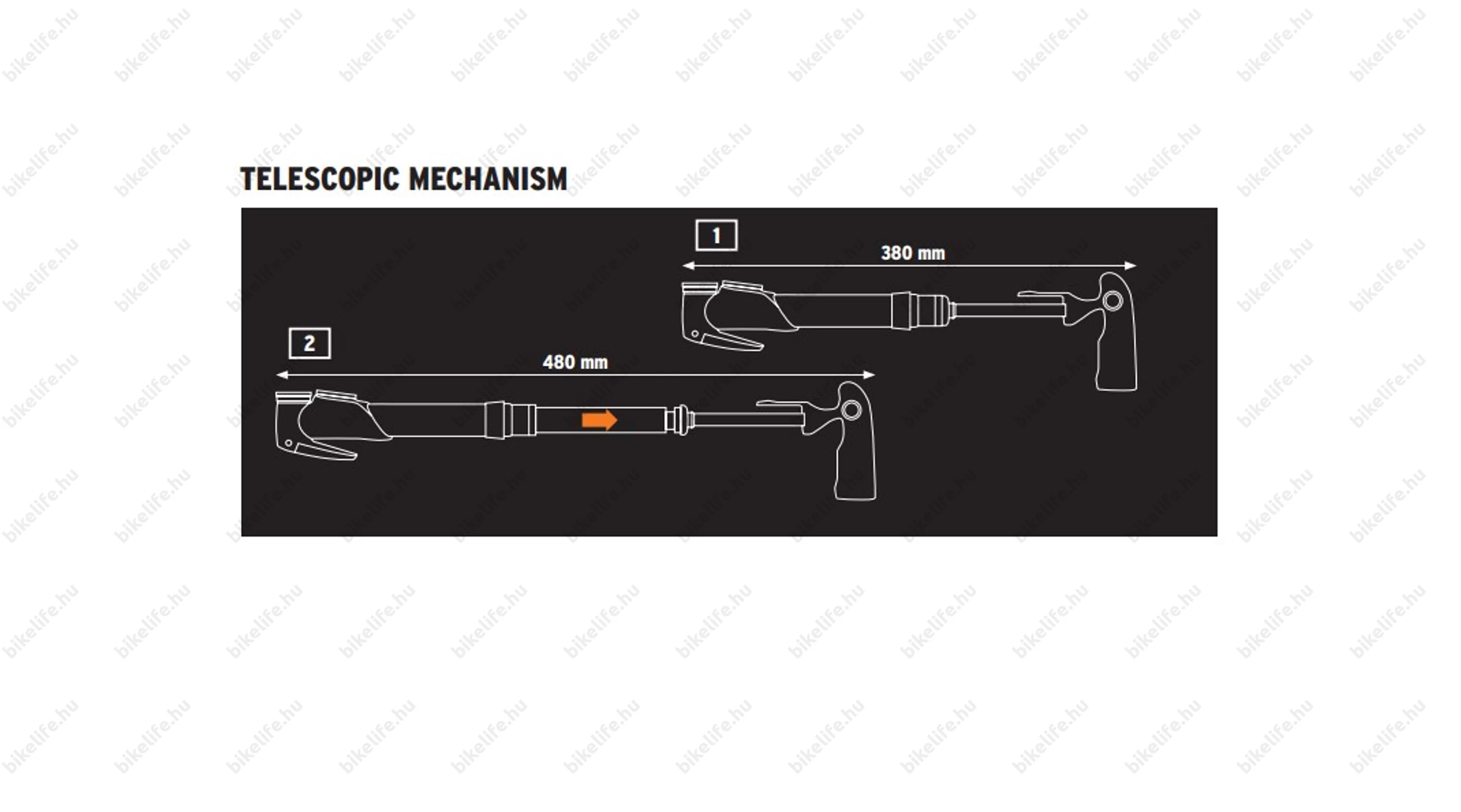 Méretek: Összecsukott állapotban 380mm, teljesen kihúzva pedig 480mm hosszú ez a pumpa. Kompakt méretének köszönhetően elfér a táskádban, nagyobb váztáskában is, de a hozzá tartozó rögzítőadapterrel a vázon lévő kulacstartó furatokba is rögzíthető, akár a kulacstartóval együtt (az alá) is.