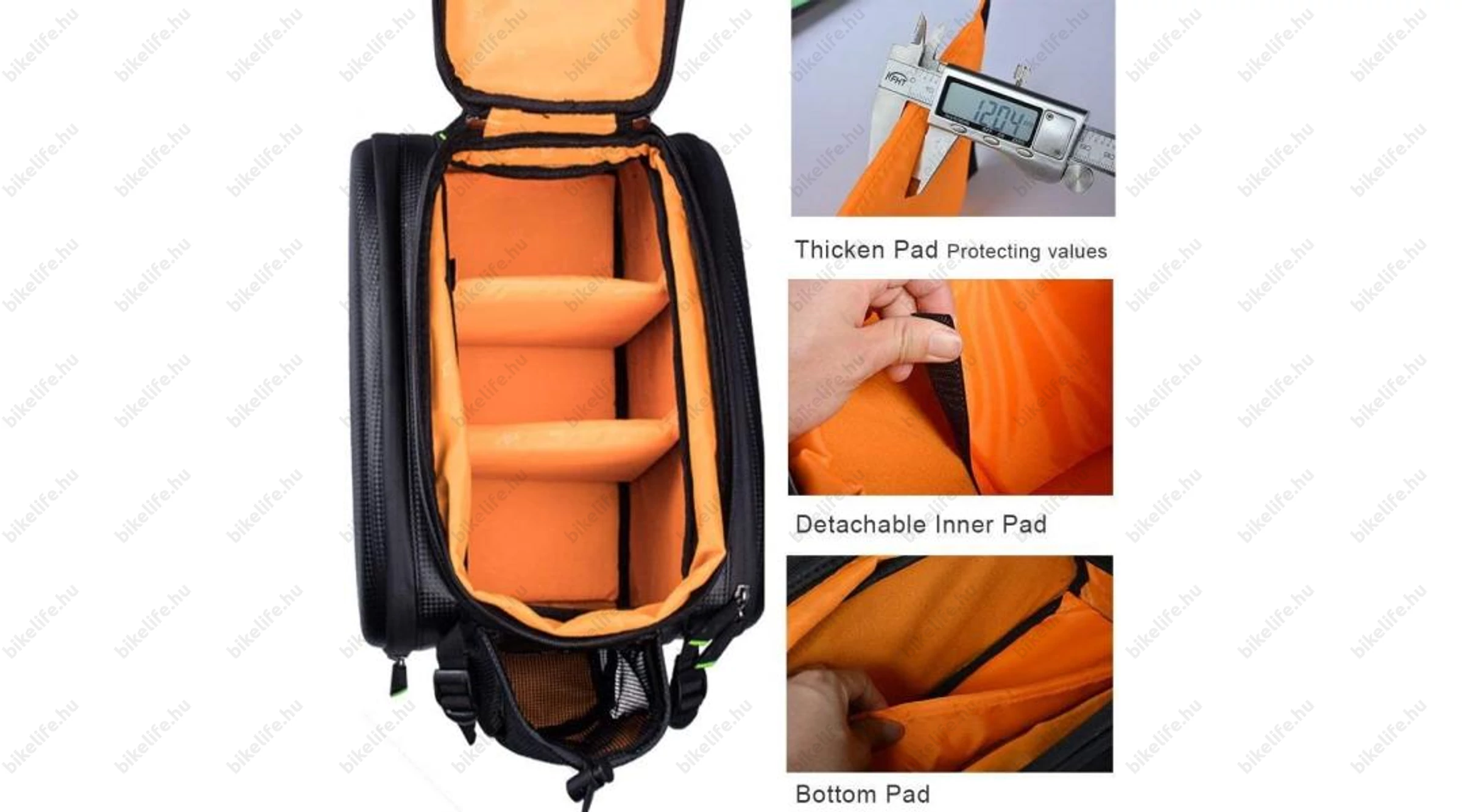 - Csatlakozás: 4 darab erős tépőzárral. Minden csomagtartóval kompatiblis. Azonban az oldalsó rekeszek használatához oldaltámasszal ellátott csomagtartó szükséges.