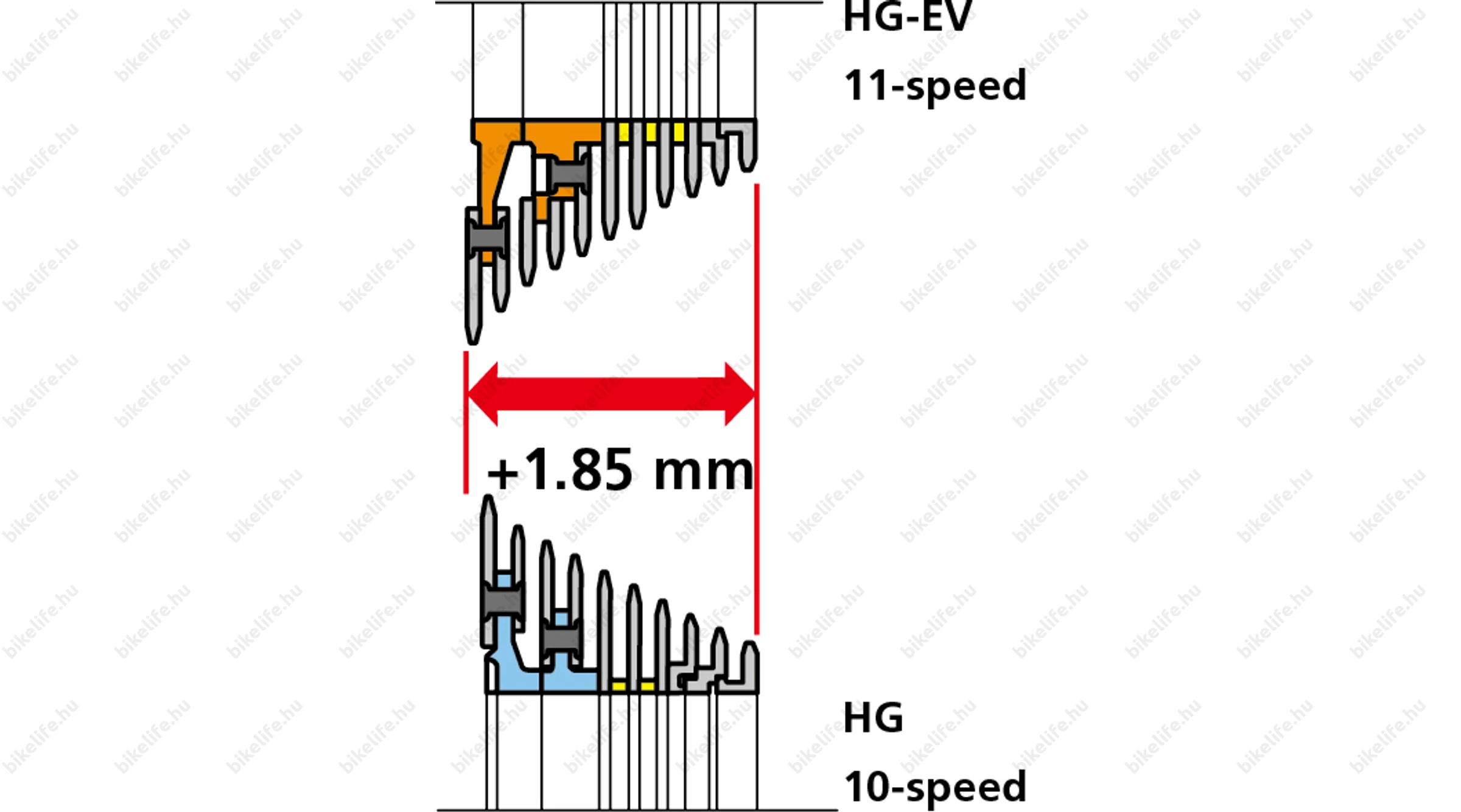 A HG-EV fogaskoszorú biztosítja a személyre szabott fogaskerék kombinációt és fordulatszám kezelést. Optimális 11 fokozatú áttételi arány biztosított a hajtásrendszerben - a kerékpározási stílusnak, ágazatnak megfelelően választhatunk szélesebb vagy szűkebb áttételi tartományt. A HG-EV fogaskoszorú a 11 fokozatú áttételi tartományt a korábbi 10 fokozatú rendszer tartósságának megőrzése mellett ám javított Hyperglide rendszerrel biztosítja. A HG-EV fogsorok mindössze 1,85 mm-el szélesebbek a 10-es HG soroknál.
