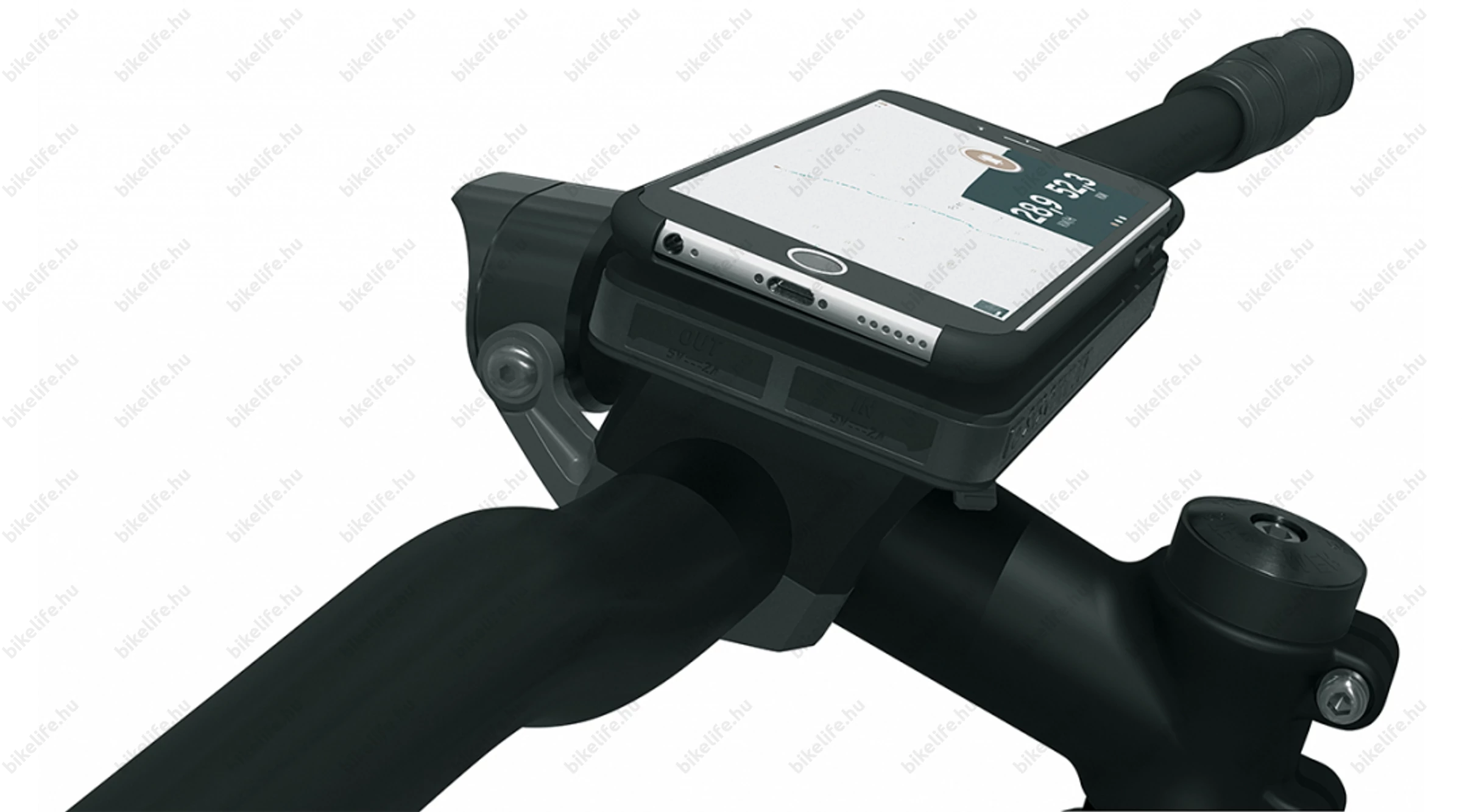 A komplett készlet a hozzá tartozó távtartókkal a szorítókarokon kívül lehetőséget kínál arra is, hogy a mobiltelefontartót középső kijelzős e-biciklikre rögzítsük, így az okostelefon és a fedélzeti számítógép zárt egységet alkot a kormányon.