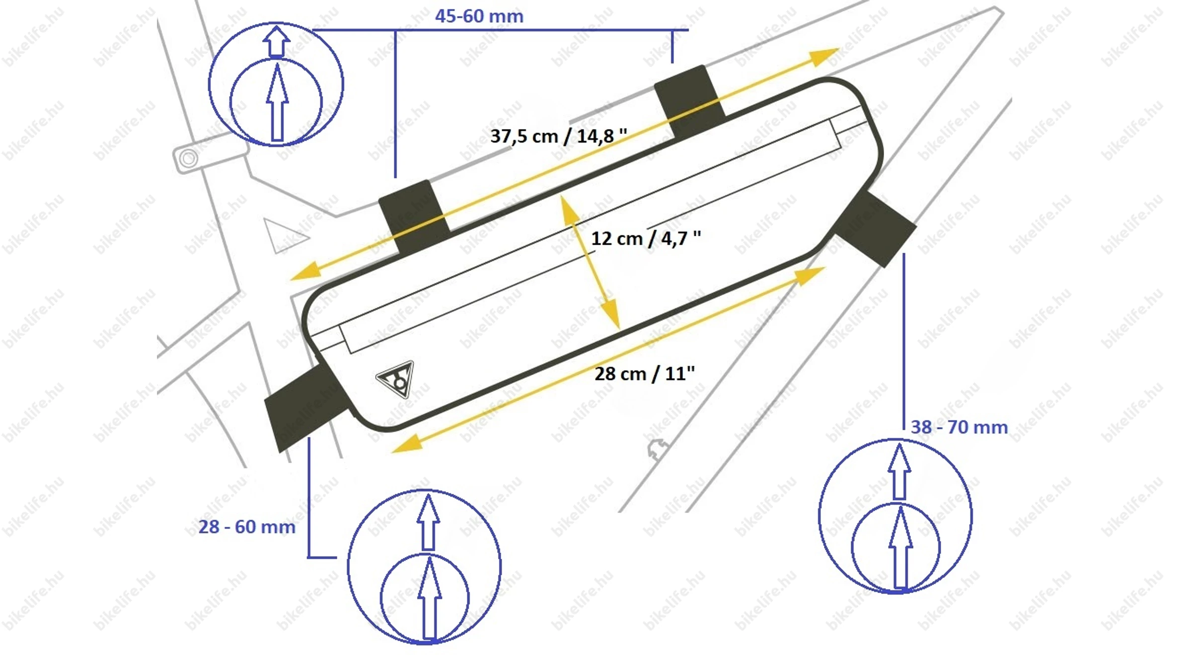 Méreteit tekintve 37,5 x 12 x 28 cm kiterjedésű. A fenti képen látható a rögzítő pántok befogadóképessége, mellyel ellenőrizheted, hogy a te vázvastagságod alkalmas-e a táska felfogatására. Szerencsére elég széles a tartomány, így nagyon ritkán fordul elő, hogy egy bicajra nem rögzíthető a Midloader. A pozitív visszajelzések is igazolják, hogy ha egyszer megveszed, biztos lehetsz benne, hogy nem fogod megbánni. :)