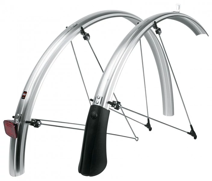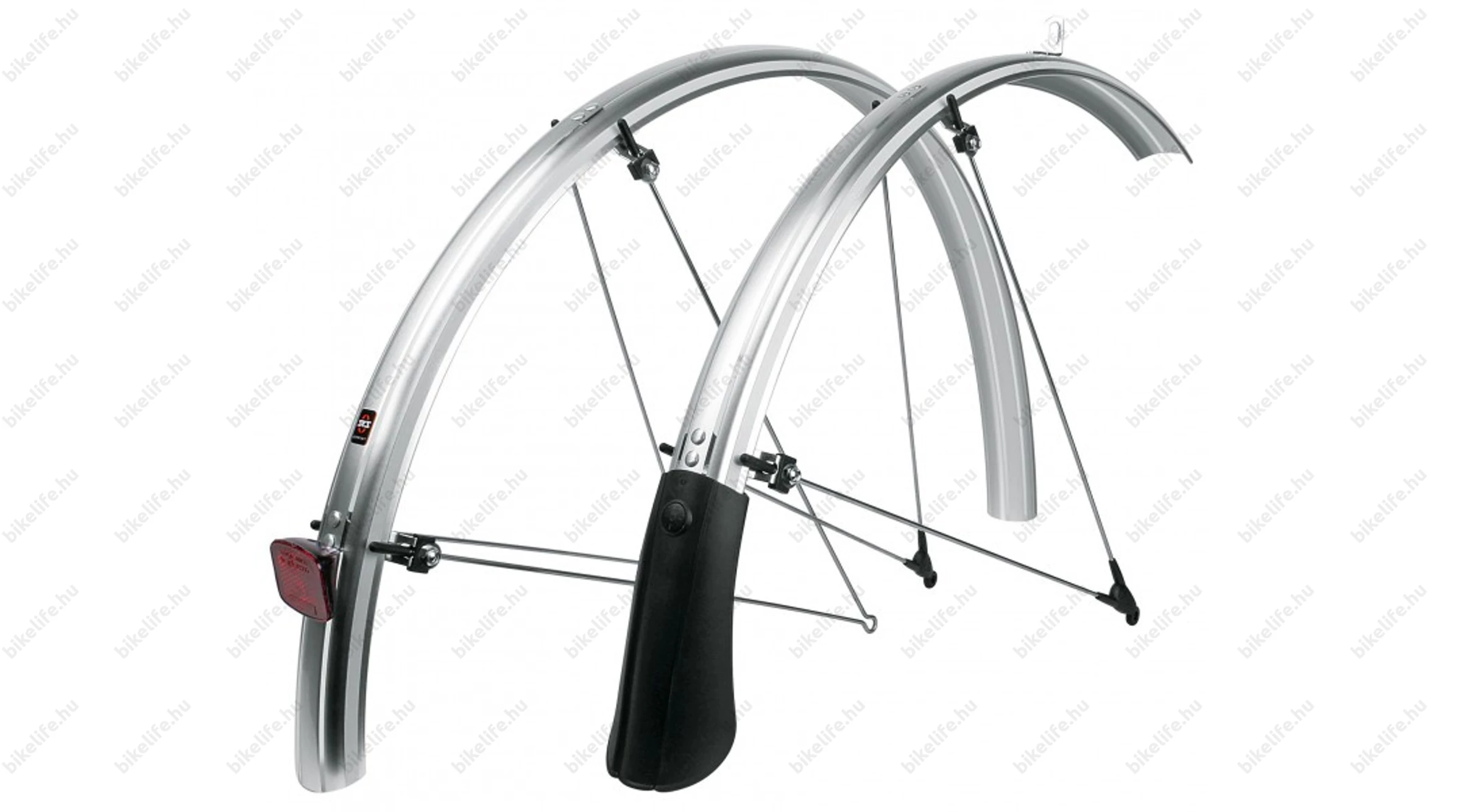 Első és hátsó sárvédő trekking kerékpárokra, aluplasztik, reflex csíkokkal, 45mm széles, fényes ezüst színű